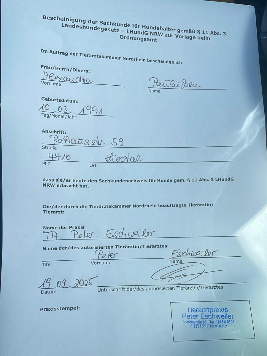 Bescheinigung Sachkundenachweis für Hundehalter gemäss Paragraph 11 Abs. 3 Landeshundegesetz NRW zur Vorlage beim Ordnungsamt
